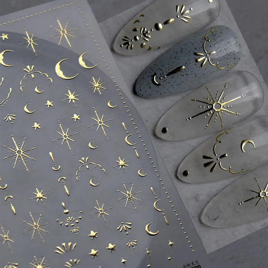 3D Gold Sun/Moon/Star Bronzing Nail Art Sticker 8*10cm Laser Star Moon Design Nail Decal Gold Silver Self-Adhesive Slider &*&