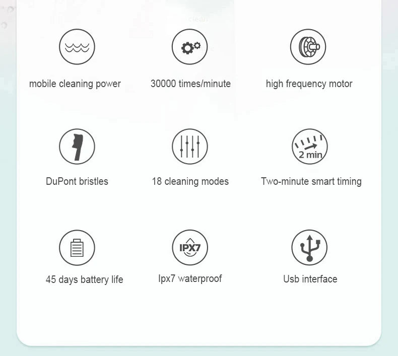 3. High-frequency Motor: The brush head is equipped with high-frequency motor and provides 360 degree multi-dimensional cleaning, so that the tooth foam can penetrate into the teeth gap and deeply clean the mouth.
